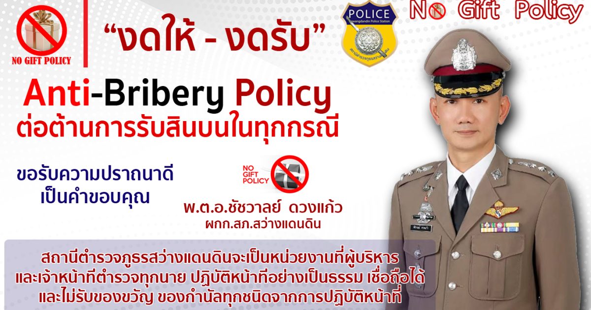 การประกาศเจตนารมณ์ของหัวหน้าสถานี 4 มีนาคม 2568 โดย admin / การมีส่วนร่วมของหัวหน้าหน่วย วันที่ 10 มีนาคม 2568 พ.ต.อ.ชัชวาลย์ ดวงแก้ว ผกก.สภ.สว่างแดนดิน ประกาศเจตนารมณ์ของหน่วยงาน ประกาศเจตนารมณ์ ในการป้องกันการและต่อต้านการทุจริตชองสถานี และประกาศ เจตนารมณ์ไม่รับของขวัญ และสินบนอื่นใด ทุกชนิดจากการปฏิบัติหน้าที่ ในหน่วยงาน FacebookFacebookXXLINELine